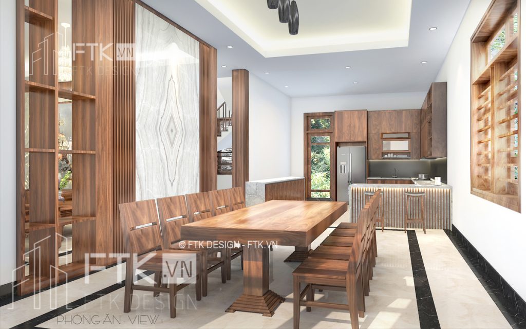 Phòng bếp liên thông bòng ăn được ngăn bởi một bàn bar nhỏ tạo sự thông thoáng tối đa. Không gian bếp ăn cũng được sử dụng hoàn toàn gỗ tự nhiên cho nội thất. Điểm nhấn của không gian là một bộ bàn ăn gỗ tự nhiên nguyên khối với vẻ đẹp thách thức thời gian.